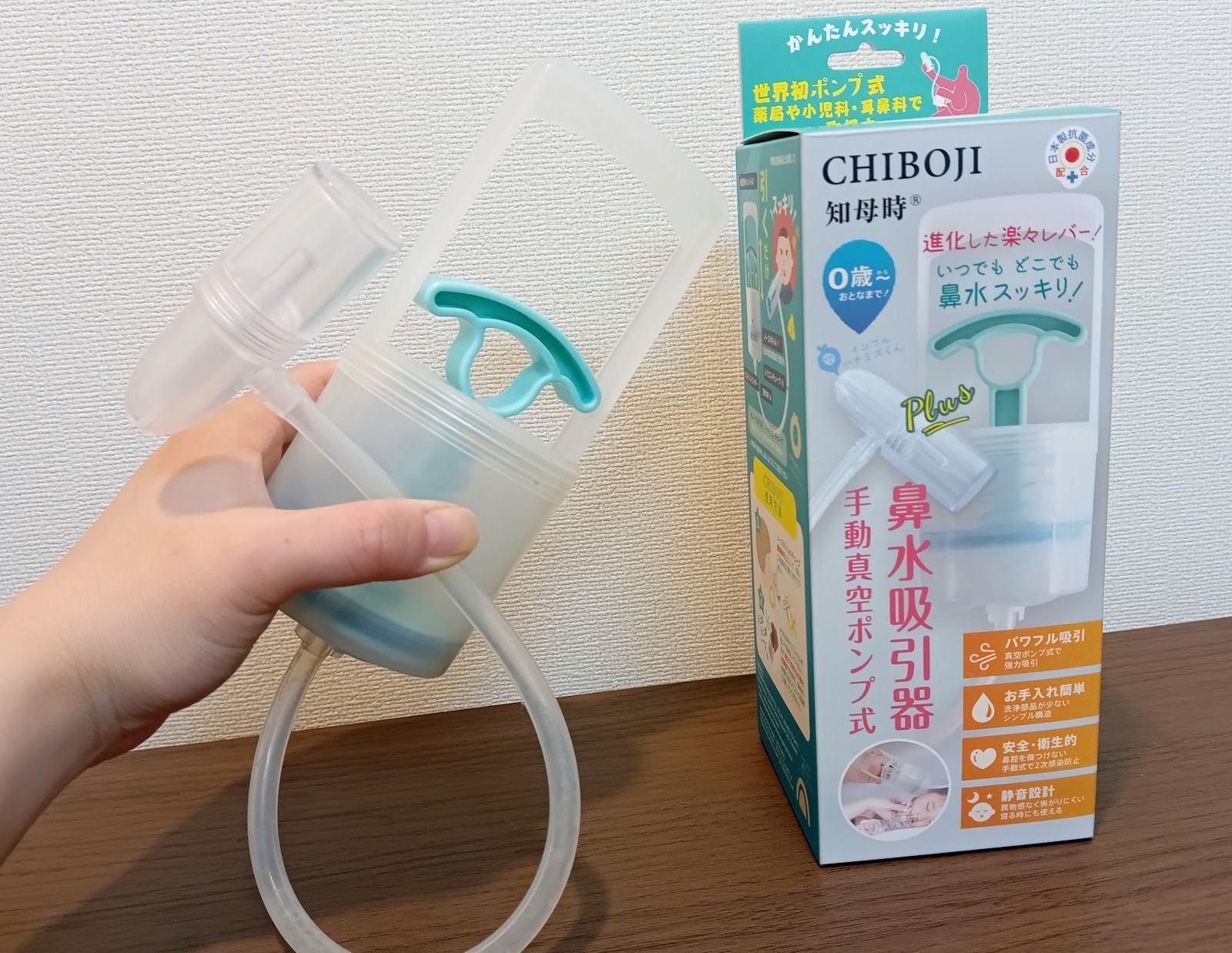 ハンドルを引くだけで鼻水を強力に吸引する「世界初」の真空ポンプ式になっています。全然力がいらないのに、鼻の奥にある鼻水までスッキリ取れるので気持ちがいいです!